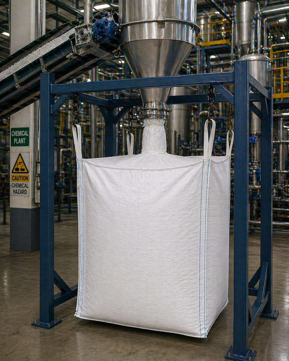 In real-world use, this configuration is a strong fit for construction materials, chemical processing, and bulk ingredient handling where flow control and contamination prevention are critical. Reinforced stitching across stress points ensures durability through repeated handling cycles, while the coated fabric adds another layer of protection against external elements.